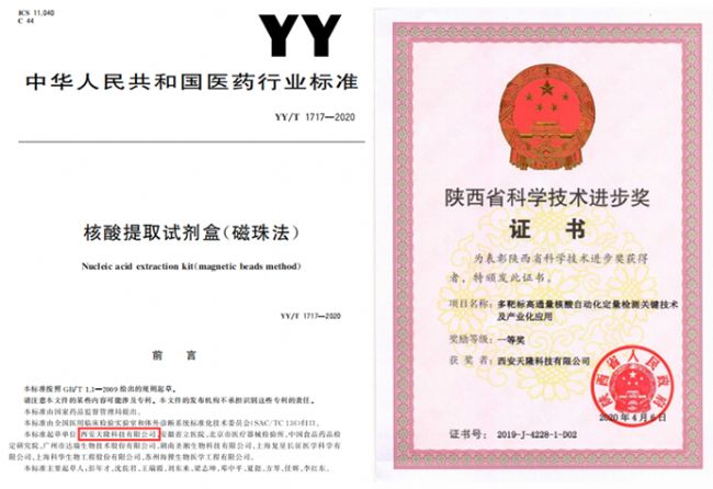 作為國內核酸檢測行業(yè)的典型代表,天隆科技在新冠抗疫期間表現卓越,為國內抗疫的基本勝利貢獻重要力量,獲得多個國家及省部級獎勵。如全國抗擊新冠肺炎疫情先進集體、2020年中國體外診斷產業(yè)領軍人物、2020年陜西最美科技工作者、全國創(chuàng)新爭先獎、陜西省科學技術進步一等獎、最美抗疫先鋒團體、全省醫(yī)藥行業(yè)抗擊新冠疫情先進集體等。此外,天隆科技牽頭制訂的國家醫(yī)藥行業(yè)標準《YY/T1717-2020核酸提取試劑盒(磁珠法)》也在2020年抗疫期間由國家藥監(jiān)局發(fā)布,填補領域空白。