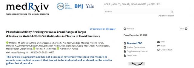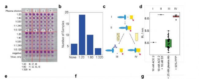 使用微流體抗體親和譜分析(MAAP),確定了42名血清陽性患者血漿樣本中抗SARS-CoV-2抗體的總親和力和濃度,其中23名經(jīng)PCR測試確認為SARS-CoV2陽性。研究發(fā)現(xiàn),盡管具有相似的抗體濃度,抗RBD抗體的解離常數(shù)(Kd)卻超過了兩個數(shù)量級,從80 pM到25 nM。該款血清抗體檢測儀(Fluidity One-W Serum)測定結(jié)果與基于細胞的中和測定法非常吻合。(如上圖)。最后確定了針對SARS-CoV-2的免疫反應(yīng)具有識別其他冠狀病毒的RBD表位的能力,這表明活化的記憶B細胞可能會產(chǎn)生中和的抗體,即使由其他未來的SARSCoV-2變體觸發(fā)也是如此?贵w濃度和親和力之間的關(guān)系可能會影響血漿置換,并靶向適當?shù)谋砦灰赃M行有效中和。