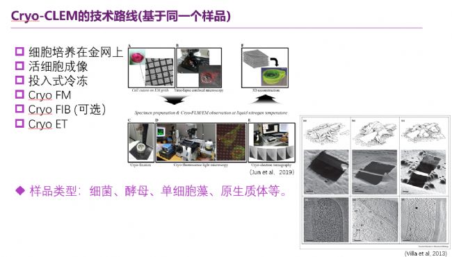 李英老師在報(bào)告中總結(jié)了當(dāng)前生物樣品光電聯(lián)用技術(shù)的幾種技術(shù)路線,包括冷凍光電關(guān)聯(lián)技術(shù)(Cryo-CLEM)和常溫超薄切片光電關(guān)聯(lián)技術(shù)。其中冷凍光電關(guān)聯(lián)技術(shù)可以把樣品培養(yǎng)或吸附在載網(wǎng)上,光鏡拍攝活細(xì)胞圖像,出現(xiàn)感興趣的現(xiàn)象后采用投入冷凍固定樣品,再進(jìn)行冷凍熒光成像,Cryo FIB (可選)和Cryo ET;其中對(duì)于生物組織或細(xì)胞團(tuán)樣品,也可以用高壓冷凍儀進(jìn)行冷凍固定,之后進(jìn)行冷凍超薄切片或Cryo FIB;或者引入Tokuyasu免疫標(biāo)記技術(shù)。