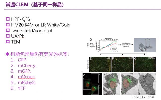 而在常溫CLEM技術(shù)應(yīng)用中,可以采用高壓冷凍和冷凍替代的實(shí)驗(yàn)流程制備生物樣品,選用合適的熒光標(biāo)簽、包埋樹脂、染料和固定液等實(shí)驗(yàn)試劑,實(shí)現(xiàn)在熒光顯微鏡和電鏡下觀察同一樣品或同一樣品切片的圖像。