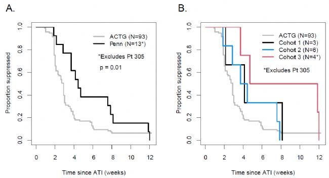 研究結(jié)果:這項研究發(fā)現(xiàn)回輸CD4 T細胞耐受性良好,沒有嚴(yán)重的不良事件。HIV功能性治愈的金標(biāo)準(zhǔn)是試驗性停藥后病毒反彈時間推遲。與歷史對照相比,觀察到病毒反彈時間略有延遲;14個人中有3個人,似乎在最終反彈之前恢復(fù)了對病毒血癥的控制(其中2個為CCR5Δ32雜合子)。