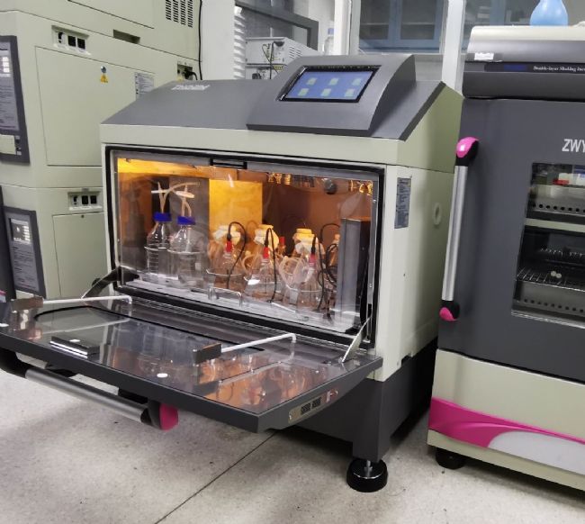 據(jù)陶教授介紹,實驗室目前主要做生物化學(xué)和代謝工程,在微生物菌種改造實驗時需用到大量的搖床,智城提供了兩款非常先進的細胞培養(yǎng)設(shè)備。首先是ZWYF-290型細胞生長曲線(OD值)在線檢測搖床,它能夠同時容納16個菌株,是目前國內(nèi)首家,無需人為干預(yù),可連續(xù)自動取樣,在線檢測細胞生長曲線的搖床,既節(jié)省了人力,又保證了數(shù)據(jù)的準(zhǔn)確度,耗材成本很低。傳統(tǒng)檢測微生物生長曲線時,每隔半小時就要取樣檢測,非常繁瑣,也容易干擾實驗進程,智城捐贈的這款儀器是理想的解決方案。