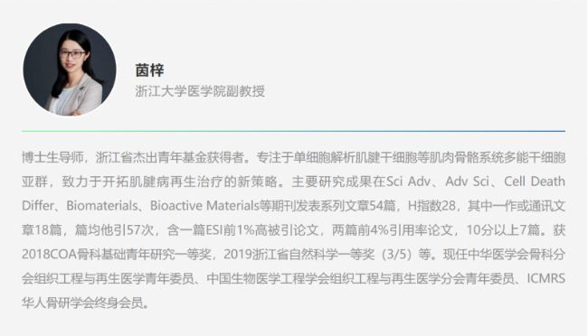 | 15:20-15:50 | 肌腱細(xì)胞亞群解析與功能鑒定 | 茵梓 副教授 浙江大學(xué)醫(yī)學(xué)院 |