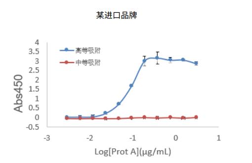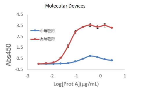 采用 ELISA 方法,檢測(cè) Molecular Devices 與某進(jìn)口品牌中等吸附和高等吸附 96 孔全透明微孔板在包被 Protein A (45k Da)抗原后,檢測(cè) OD450 的結(jié)果。如下圖所示,無論 MolecularDevices 還是某進(jìn)口品牌,高等吸附板都能結(jié)合更多的 ProteinA,同時(shí) Molecular Devices 全透明微孔板有更優(yōu)的復(fù)孔重復(fù)性。