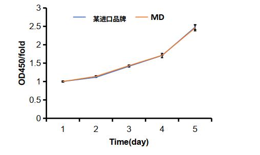 在 Molecular Devices 和某進(jìn)口品牌微孔板上接種 Huh-7 細(xì)胞,培養(yǎng) 5 天后,經(jīng) CCK8 處理 2 小時(shí),用酶標(biāo)儀檢測(cè) OD 450 nm吸光度的變化來反應(yīng)細(xì)胞活力。如下圖所示,CCK8 檢測(cè)細(xì)胞增殖使用 Molecular Devices 和某進(jìn)口品牌微孔板無顯著差異。