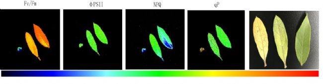 下圖為易科泰工程師與實驗室研究人員安裝運行期間,選取3片不同黃化程度的杜鵑葉片進行的成像分析(自左至右依次為最大光量子產量Fv/Fm成像、有效光量子產量成像、非光化熒光淬滅NPQ成像、光化淬滅成像、RGB成像)。