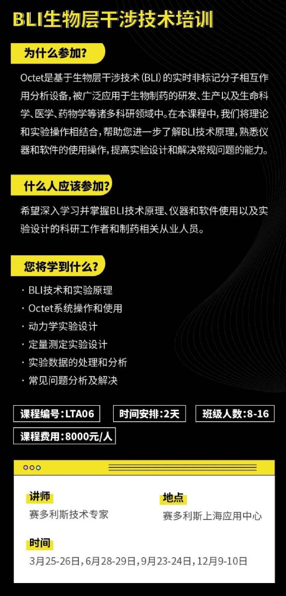 本次培訓(xùn)在原有內(nèi)容基礎(chǔ)上進(jìn)行了優(yōu)化,深入講解BLI技術(shù)原理和動(dòng)力學(xué)及定量理論,剖析實(shí)驗(yàn)設(shè)計(jì)及實(shí)驗(yàn)中的常見問題,并結(jié)合儀器和軟件的使用操作,切實(shí)提高了學(xué)員設(shè)計(jì)實(shí)驗(yàn)和解決常規(guī)問題的能力。