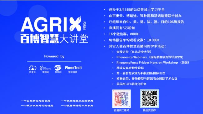 為幫助大家了解知識產(chǎn)權(quán)保護、育種研發(fā)服務(wù)、種質(zhì)資源托管、基因型分型、基因編輯、表型組學(xué)、人工智能和育種大數(shù)據(jù)等前沿技術(shù),同時也為同行們相互交流提供更多的機會,由百奧云、博瑞迪、智種網(wǎng)和慧諾瑞德等新銳力量秉持資源整合、平臺共享、匯聚眾智、創(chuàng)新引領(lǐng)的原則,聯(lián)合組織公益性線上學(xué)習(xí)平臺——百博智慧大講堂,邀請行業(yè)經(jīng)驗豐富的專家、老師進行線上交流,共同探討新形勢下種業(yè)發(fā)展思路,共同“破冰”。