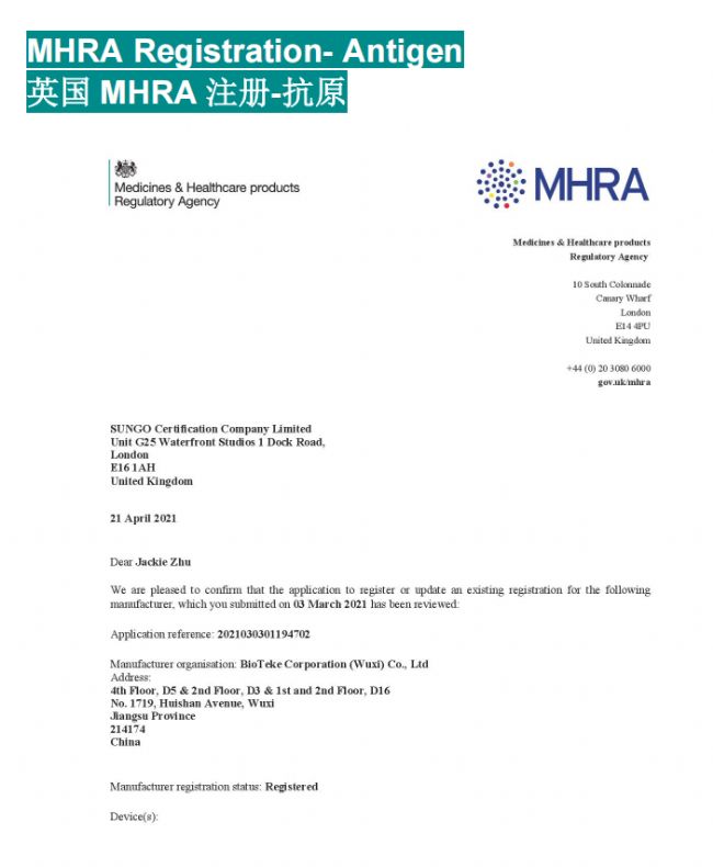 在臨床研究中靈敏度為96.23%,特異度超過99%”。百泰克抗原檢測卡目前已取得: