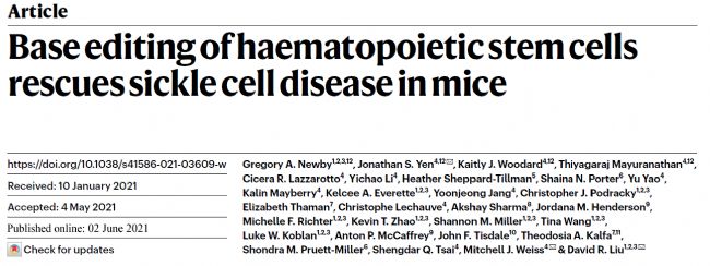 2021年6月2日,博德研究所David R. Liu(劉如謙)等團(tuán)隊在Nature 在線發(fā)表題為“Base editing of haematopoietic stem cells rescues sickle cell disease in mice”的研究論文,該研究使用定制的腺嘌呤堿基編輯器(ABE8e-NRCH),將SCD鐮狀細(xì)胞病血紅蛋白基因(HBBS) 轉(zhuǎn)換為無害的Makassar β-珠蛋白(HBBG)。研究團(tuán)隊使用了ABE8e-NRCH 蛋白+sgRNA組成的核糖核蛋白(RNP)或ABE8e-NRCH mRNA+sgRNA,通過MaxCyte電轉(zhuǎn)系統(tǒng)導(dǎo)入到CD34+造血干細(xì)胞和祖細(xì)胞(HSPC)中,對其進(jìn)行進(jìn)行堿基編輯,檢測到80% 的 HBBS 轉(zhuǎn)化為 HBBG。將編輯過的人類 HSPC 移植到免疫缺陷小鼠中,16周后修復(fù)后的HBBG基因型占比仍達(dá)到68%,鐮狀細(xì)胞減少了5倍,表明基因編輯是持久的。并且利用MaxCyte電穿孔技術(shù)能夠加快單堿基技術(shù)快速進(jìn)行臨床轉(zhuǎn)化,最大程度保證安全性。