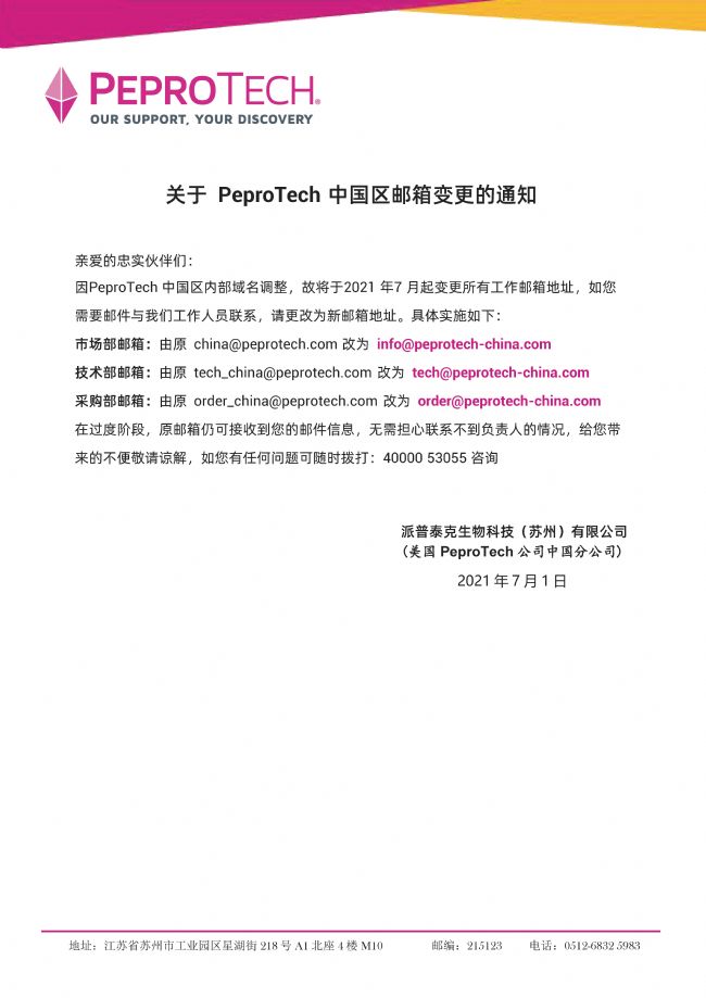 > 遷址 > 通知函:PeproTech China中國區(qū)郵箱地址變更