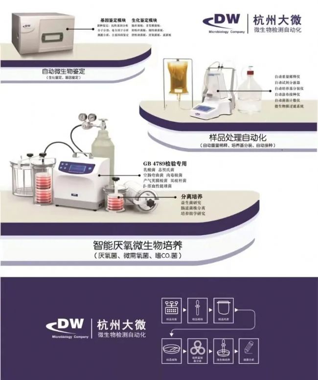 “杭州大微”品牌DW系列微生物儀器:微生物樣品前處理自動化系列、厭氧及微需氧微生物培養(yǎng)系列、微生物鑒定分型溯源系列、微生物快速檢測系列。