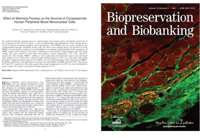 其研究成果文章:“Effect of Warming Process on the Survival ofCryopreserved Human Peripheral Blood Mononuclear Cells”,發(fā)表在國際生物樣本庫協(xié)會(huì)官方雜志《Biopreservation and Biobanking》雜志上。