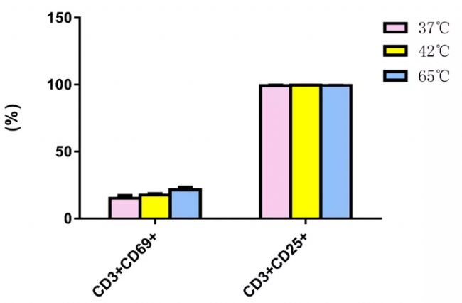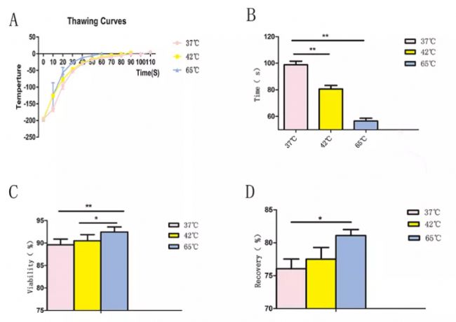 該研究考察了不同溫度復(fù)蘇對(duì)PBMCs活性和功能的影響。PBMCs樣本經(jīng)過慢速冷凍后,存儲(chǔ)在液氮罐中,分別在不同溫度(37℃、42℃和65℃)下復(fù)蘇。實(shí)驗(yàn)發(fā)現(xiàn):PBMCs樣本在65℃下進(jìn)行水浴復(fù)蘇,相比于37℃和42℃復(fù)蘇,可以顯著降低復(fù)蘇所需要的時(shí)間,從而減少其在復(fù)溫過程中因重結(jié)晶和潛在的玻璃化造成的低溫?fù)p傷,保持了PBMCs各亞群的比例不變,維持了T細(xì)胞的活化和增殖能力,縮短了復(fù)蘇時(shí)間,提高了細(xì)胞的活率和回收率以及T細(xì)胞在抗原刺激后細(xì)胞因子的分泌能力。