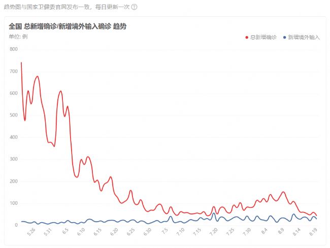 據(jù)國家衛(wèi)健委報(bào)道:截至8月19日24時(shí),據(jù)31個(gè)。ㄗ灾螀^(qū)、直轄市)和新疆生產(chǎn)建設(shè)兵團(tuán)報(bào)告,現(xiàn)有確診病例1817例(其中重癥病例54例),累計(jì)治愈出院病例88126例,累計(jì)死亡病例4636例,累計(jì)報(bào)告確診病例94579例,現(xiàn)有疑似病例4例。累計(jì)追蹤到密切接觸者1155346人,尚在醫(yī)學(xué)觀察的密切接觸者40859人。