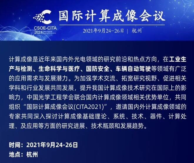 2021年9月24-26日,由中國(guó)光學(xué)工程學(xué)會(huì)主辦的2021國(guó)際計(jì)算成像會(huì)議(CITA2021)將在杭州隆重召開(kāi)。