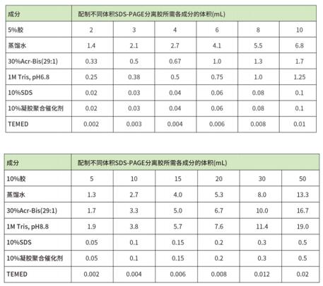 使用傳統(tǒng)的30%acr-bis、TRIS-HCl、SDS、AP、TEMED等配制凝膠,要按照不同濃度取不同體積的各組分進(jìn)行混合,大多數(shù)情況下,組分體積不能取整,往往需要準(zhǔn)備凝膠配制組分表格,按表配膠。極速凝膠配制試劑盒內(nèi)的組分已按照膠濃度預(yù)混,配制凝膠時(shí),膠溶液與緩沖液按1:1混勻,再加入約1%體積的改良型過硫酸銨溶液即可。