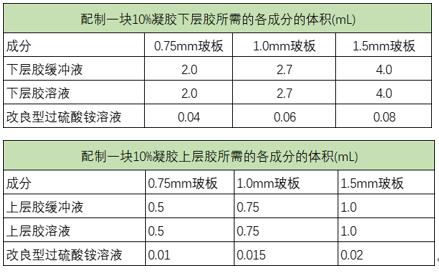 以配制一塊10%(1.5 mm玻璃板)凝膠為例,分別取4.0mL下層膠緩沖液、下層膠溶液混勻,向8ml混合液中加80ul的改良型過硫酸銨溶液,混勻后立刻灌膠。然后取1.0 mL上層膠緩沖液、上層膠緩沖液,向2ml混合液中加20ul的改良型過硫酸銨溶液,混勻后立刻注入制膠玻璃板中,插入梳齒,等凝固后即可電泳。