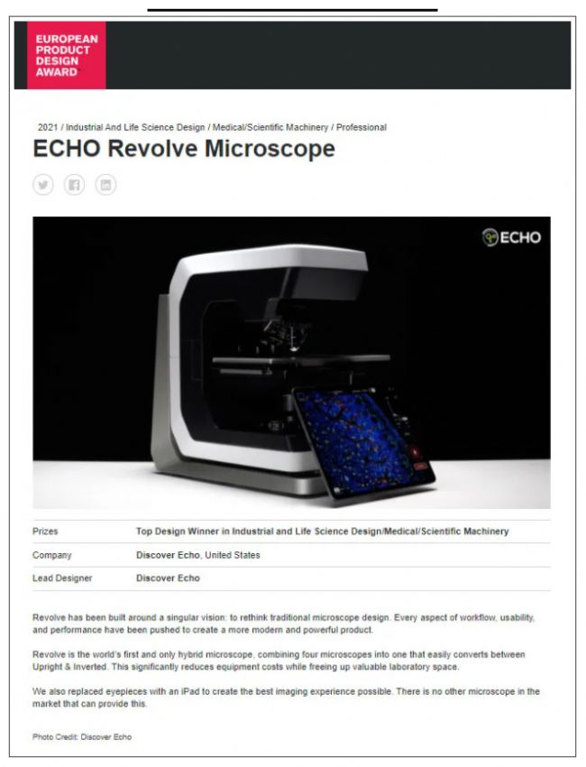 2021年度歐洲產(chǎn)品設(shè)計獎近日揭曉,美國ECHO Revolve正倒置一體電動熒光顯微鏡憑借出色的外觀設(shè)計、功能設(shè)計榮獲歐洲產(chǎn)品設(shè)計工業(yè)/生命科學(xué)/醫(yī)療/科學(xué)機械類的最高榮譽白金獎。