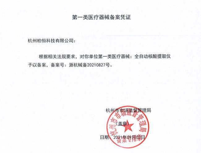 一類醫(yī)療器械注冊認證(備案號:浙杭械備20210827號),同時還獲得第一類醫(yī)療器械生產備案(備案編號:浙杭食藥監(jiān)械生產備20210098號)。至此,柏恒科技在原有PCR儀的產品線上又擴充了一個大的品類,為我們逐步開發(fā)完善分子生物學實驗設備產品鏈又邁進了一步。