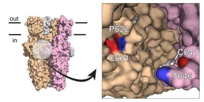 圖1. TRPA1胞內(nèi)段的可能與WaTx的口袋,其中P622是一個(gè)重要的口袋組成氨基酸位點(diǎn)