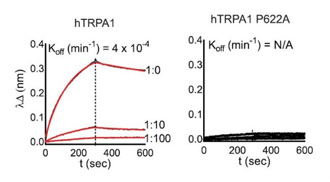 圖2. TRPA1可以與WaTx反應(yīng),而P622A不反應(yīng),驗(yàn)證了結(jié)構(gòu)學(xué)解析的結(jié)果(Octet® RED384)。