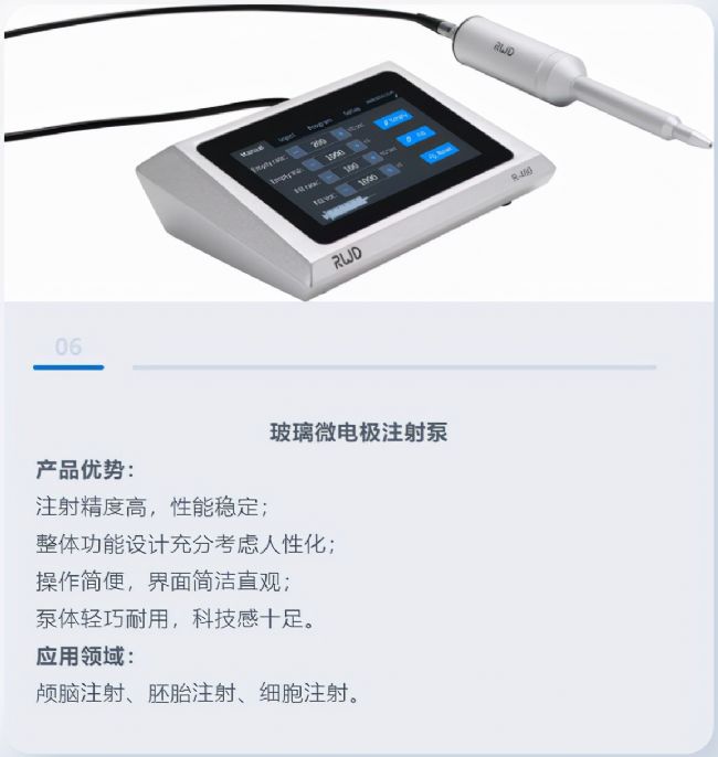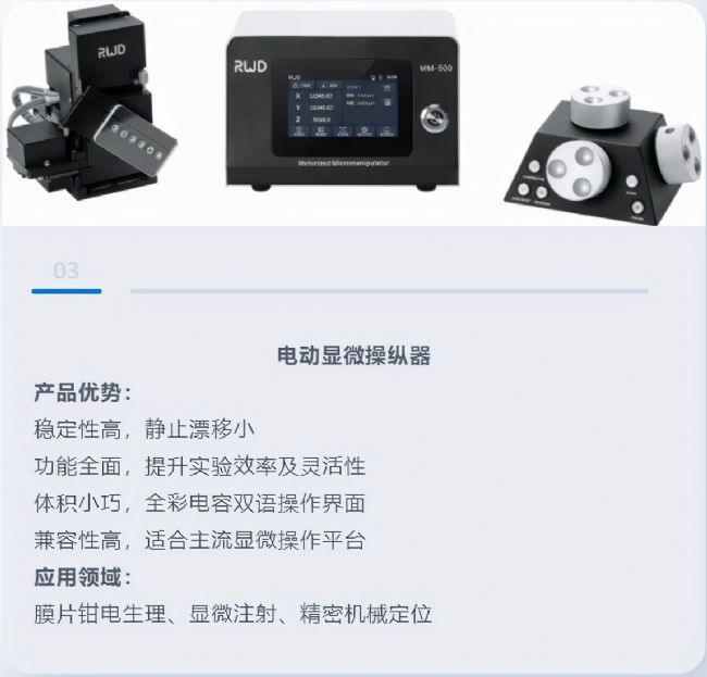 儀器是科學(xué)研究和技術(shù)發(fā)展的基石,為助力科研人員能在神經(jīng)科學(xué)重點(diǎn)垂直細(xì)分領(lǐng)域有效開展研究,本次瑞沃德展臺(tái)也展示了最新研制的六大新品:玻璃微電極注射泵、微電極拉制儀、電動(dòng)顯微操縱器、三色多通道光纖記錄系統(tǒng)、單細(xì)胞懸液制備儀、冷凍切片機(jī)。涵蓋了從動(dòng)物實(shí)驗(yàn)到細(xì)胞分子實(shí)驗(yàn),滿足不同實(shí)驗(yàn)場(chǎng)景需求。