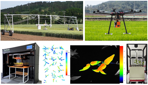 上左圖:PlantScreen大田高通量作物表型分析平臺;上右圖EcoDrone®一體式高光譜-紅外熱成像無人機(jī)遙感系統(tǒng);下圖從左到右依次為:PhenoTron-YZ作物表型與種質(zhì)資源檢測分析平臺、綠豆苗期高光譜成像分析、綠豆苗期葉綠素?zé)晒獬上穹治、PhenoTron-SR作物表型分析平臺(根系與植株同時(shí)進(jìn)行光譜成像分析)