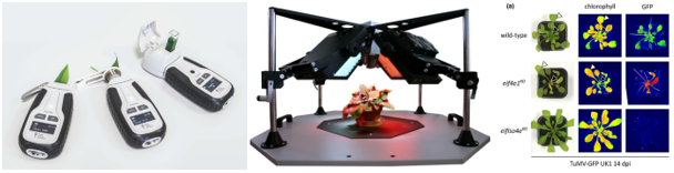植物表型成像分析技術(shù)整合了RGB 真彩 3D 成像、激光雷達3D點云建模、葉綠素?zé)晒獬上、植物熱成像、植物高光譜成像等植物成像分析技術(shù)與LED植物智能培養(yǎng)、自動化控制、自動條碼識別管理、自動稱重與澆灌系統(tǒng)等植物工廠使用的自動化培養(yǎng)技術(shù),以最優(yōu)化的方式實現(xiàn)大批量植物樣品——模式植物擬南芥、煙草;農(nóng)作物如小麥、玉米;藻類等的全方位生理生態(tài)與形態(tài)結(jié)構(gòu)成像分析,可以對植物或藻類表型組進行全面、自動、高通量且無人值守的長期研究分析,獲取和研究植物整個生活史的生理變化和表型分析的所有相關(guān)海量數(shù)據(jù),使研究人員能夠全面解析植物生長過程中的各種表型變化。這一技術(shù)的代表儀器主要包括PlantScreen植物表型成像分析平臺、PhenoTron®植物表型成像分析系統(tǒng)、AlgaTech®高通量藻類表型成像分析平臺、PhenoPlot®輕便型大田作物表型成像分析平臺等。