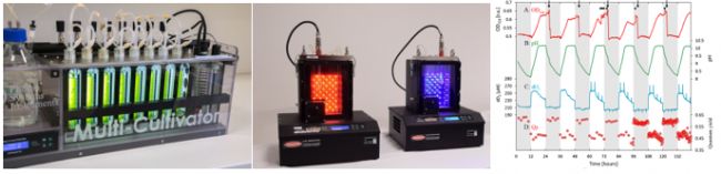 MC1000 8通道藻類培養(yǎng)與在線監(jiān)測系統(tǒng)和FMT150藻類培養(yǎng)與在線監(jiān)測系統(tǒng)將藻類光生物反應(yīng)器技術(shù)與藻類生理監(jiān)測技術(shù)(葉綠素?zé)晒饧夹g(shù)、光密度測量)結(jié)合起來的系統(tǒng),集成了目前幾乎所有主要的藻類在線培養(yǎng)與生理監(jiān)測技術(shù)。這兩種系統(tǒng)運用全LED光源,最高光強可達3000μmol/m2/s,還能精確控制溫度、光質(zhì)、培養(yǎng)周期、CO2濃度、恒濁、恒化等培養(yǎng)條件,模擬自然周期變化,對培養(yǎng)溫度、pH、溶解氧、葉綠素?zé)晒、光密度OD680和OD730在線實時監(jiān)測,實現(xiàn)了藻類的精確培養(yǎng)與光合生理的同步監(jiān)測。