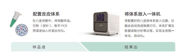 一體式的“Drop A200全自動數(shù)字PCR分析儀”是國內(nèi)首款全自動、一體化數(shù)字PCR儀,將實驗流程中的微滴生成、PCR擴增和熒光檢測等環(huán)節(jié)集成一體,簡化實驗操作、縮短實驗時間,開創(chuàng)了數(shù)字PCR“樣本進(jìn)、結(jié)果出”的全新使用模式?稍3小時內(nèi)完成96樣本的自動檢測(包含PCR擴增的時間),使用流程如圖7所示。