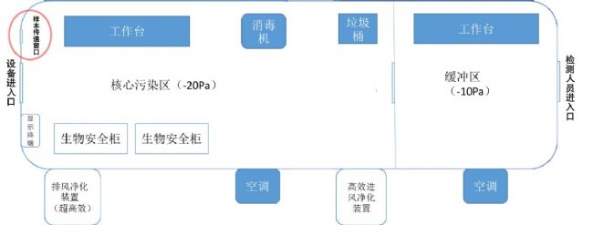 檢測(cè)人員身穿三級(jí)防護(hù),從檢測(cè)入口進(jìn)入,通過緩沖區(qū)和核心污染區(qū)的隔離門進(jìn)入污染區(qū),樣本從樣本傳遞窗傳遞進(jìn)入核心污染區(qū),在核心污染區(qū)內(nèi)的生物安全柜里打開樣本管進(jìn)行操作。操作結(jié)束后,返回緩沖區(qū),按SOP脫去防護(hù)服后從緩沖區(qū)走出移動(dòng)方艙實(shí)驗(yàn)室。以上操作可以有效的避免人員與陽性樣本的交叉污染,避免操作人員接觸到病毒,確保人員安全。