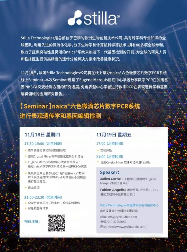 11月18日,法國Stilla Technologies公司將舉辦naica®六色微滴芯片數(shù)字PCR系統(tǒng)線上Seminar,本次Seminar邀請了Eugène Marquis癌癥中心學者分享數(shù)字PCR在腫瘤基因PIK3CA突變檢測方面的研究進展,免疫表型中心學者進行數(shù)字PCR在表觀遺傳學和基因編輯領域的應用研究報告;同時,還將舉辦線上naica®數(shù)字PCR實驗培訓,屆時歡迎大家前來學習。