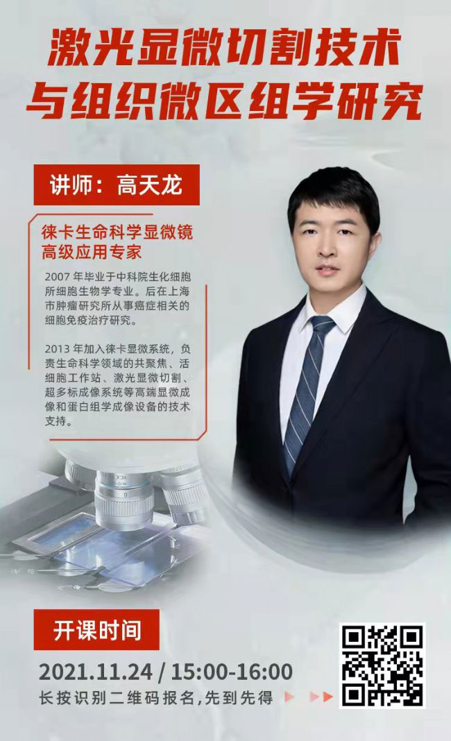 「激光顯微切割技術與組織區(qū)組學研究」線上分享,邀請到徠卡生命科學顯微鏡高級應用專家高天龍向大家介紹這項技術的原理、特性和在多個領域的應用情況。掃碼即可免費