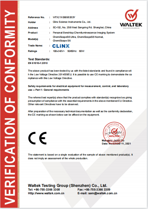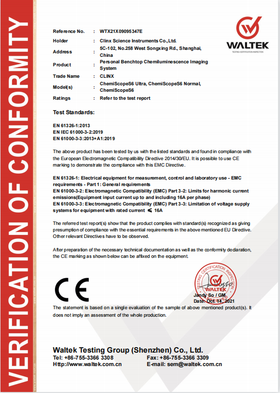 ChemiScope S6系列一體式化學(xué)發(fā)光成像儀經(jīng)歐盟CE認(rèn)證機(jī)構(gòu)對(duì)技術(shù)文件、產(chǎn)品的嚴(yán)格測(cè)試與檢驗(yàn),順利通過了安全、電磁兼容等各項(xiàng)指標(biāo)測(cè)定,獲得歐盟認(rèn)證機(jī)構(gòu)頒發(fā)的CE認(rèn)證證書,是上海勤翔繼GenoSens2000系列凝膠成像系統(tǒng)、ChemiScope6000系列化學(xué)發(fā)光成像系統(tǒng)后又一獲得CE認(rèn)證的產(chǎn)品!