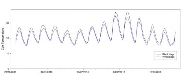 研究結(jié)果表明,即使椰殼纖維種植袋的顏色也會(huì)對(duì)作物生長(zhǎng)產(chǎn)生重大影響。研究發(fā)現(xiàn),黑色種植袋吸收更多的太陽(yáng)輻射,形成更溫暖的根區(qū)(尤其是在生長(zhǎng)季節(jié)的早期),而白色種植袋反射更多的輻射到作物冠層(見(jiàn)下圖了解對(duì)基質(zhì)溫度的影響)。因此,植物生長(zhǎng)和結(jié)果的時(shí)間可以通過(guò)選擇特定種植袋顏色這樣簡(jiǎn)單的方法來(lái)控制。