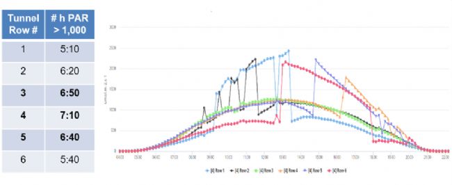 WET中心的另一個(gè)實(shí)驗(yàn)方向是大棚內(nèi)光合有效輻射(PAR)水平的影響——采用DelTa-T的QS5 PAR傳感器進(jìn)行測(cè)量。2020年的PAR水平遠(yuǎn)遠(yuǎn)高于10年的平均水平。