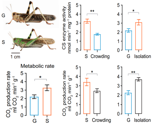 研究發(fā)現(xiàn),蝗蟲飛行肌中的能量代謝過程的差異是群居型和散居型飛蝗飛行特征和能力分化的主要原因。相較于群居型飛蝗,散居型飛蝗無論是在靜息狀態(tài)下還是在飛行過程中,均表現(xiàn)出較高的能量代謝模式。進一步的能量代謝相關基因表達分析、呼吸代謝檢測、RNA干擾及藥理學功能驗證表明,散居型飛蝗飛行肌高能量代謝模式提供了較多的飛行所需能量,但在飛行過程中會產(chǎn)生更多的活性氧,從而造成氧化壓力積累并抑制其長距離飛行能力。相反,群居型飛蝗相對較低的能量代謝使其在長時間飛行過程中能夠保持較少的活性氧產(chǎn)生,從而維持飛行肌的氧化壓力平衡。通過改變飛蝗種群密度,他們發(fā)現(xiàn)兩型飛蝗的飛行特點、飛行肌能量代謝相關基因的表達以及飛行過程中活性氧的產(chǎn)生,能夠向相反的方向改變。這充分地說明蝗蟲成長過程中經(jīng)歷的種群密度塑造了這種飛行特征。