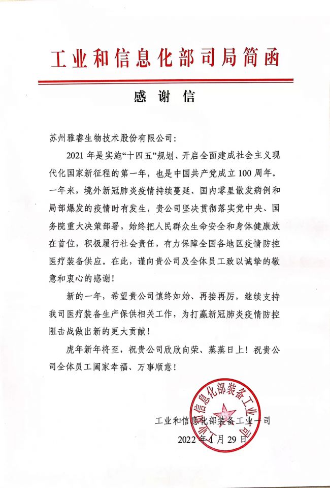2022年1月29日,蘇州雅睿生物技術(shù)股份有限公司收到一封來(lái)自工業(yè)和信息化部裝備工業(yè)一司的感謝信,對(duì)蘇州雅睿生物技術(shù)股份有限公司在抗擊疫情,保供醫(yī)療裝備生產(chǎn)相關(guān)工作的鼎力支持表示感謝。