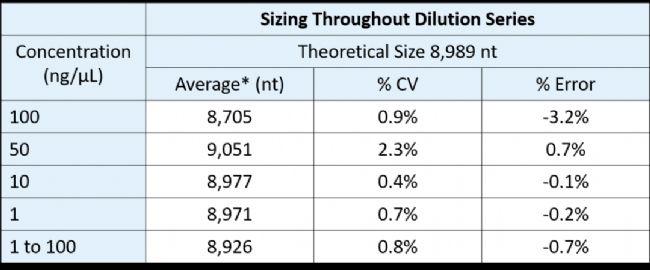 表2 濃度分別為1ng/μL、10ng/μL、50ng/μL、100ng/μL,理論長度為8,989nt 的IVT mRNA的平均片段大小、%CV、%Error統(tǒng)計(jì),n=3。