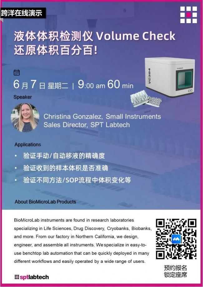 2021年2月,英國SPT Labtech正式收購BioMicroLab公司,此次收購從戰(zhàn)略上擴(kuò)展并豐富了SPT Labtech集團(tuán)在生命科學(xué)領(lǐng)域中樣本自動化管理的產(chǎn)品線。其中BioMicroLab的液體體積檢測儀VolumeCheck適用于各類實驗平臺,應(yīng)用廣泛,操作簡單,同時具有快速的掃描速度、優(yōu)秀的精確度,可以檢測12,24,48,96和384孔板,以及離心管,凍存管,采血管多種類型管子?稍30秒內(nèi)快速檢測出一塊384孔板的樣本體積,誤差可以達(dá)到2μL以下。