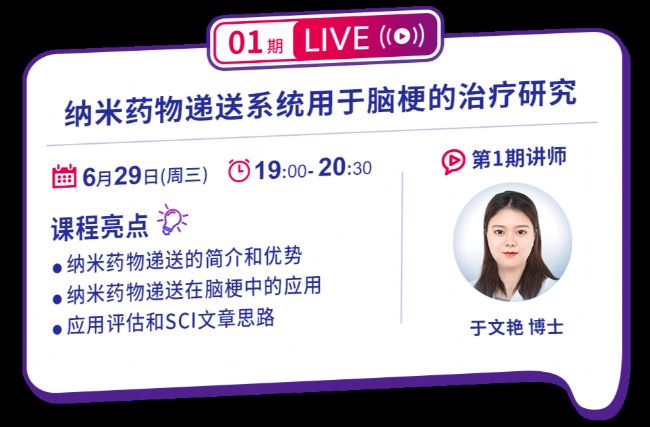 第一期直播邀請到了鄭州大學(xué)藥學(xué)院于文艷博士,為我們帶來“納米藥物遞送系統(tǒng)用于腦梗的治療研究”主題分享,6月29日(周三)19:00準(zhǔn)時開講,敬請期待~