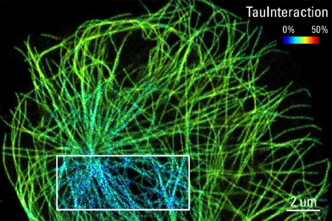 mfD作為一個(gè)新的TauSense工具,稱為TauInteraction。TauInteraction的工作原理如下(圖一):在FRET實(shí)驗(yàn)中,可能有許多分子(供體和受體)非常接近,如果這些是隨機(jī)事件,發(fā)生FRET的平均分子數(shù)量可以忽略不計(jì)。相反,如果分子之間存在活躍的相互作用,它們保持緊密接近的時(shí)候?qū)⒁鸸w熒光壽命的降低。如果發(fā)生這種情況,TauInteraction會(huì)報(bào)告導(dǎo)致這種變化的分子比例。實(shí)驗(yàn)結(jié)果是一張TauInteraction圖,其中包含在逐個(gè)像素級別上相互作用的分子的比例,圖片將實(shí)時(shí)(即在圖像采集期間)展現(xiàn)。此外,還提供了供體的熒光強(qiáng)度,如果需要,可以使用基于強(qiáng)度的FRET工具進(jìn)行獨(dú)立分析。