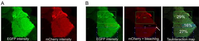 圖二:活細(xì)胞中的TauInteraction。A)來自EGFP-mCherry串聯(lián)的強(qiáng)度圖像。B)在細(xì)胞上設(shè)置了三個(gè)感興趣區(qū)(ROI),并在ROI1中使用高光強(qiáng)來漂白受體分子。圖中顯示了EGFP和mCherry的強(qiáng)度。