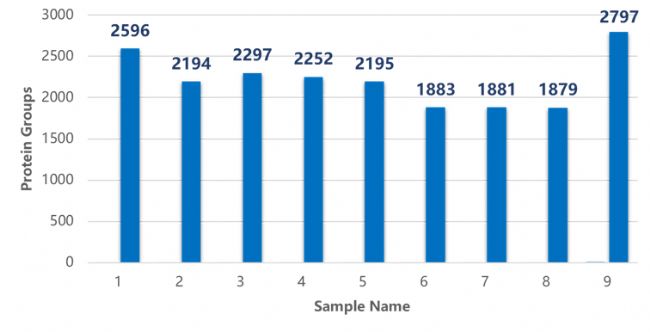 中科新生命內(nèi)測數(shù)據(jù)如下所示,通過樣本制備方法的優(yōu)化、質(zhì)譜方法以及數(shù)據(jù)分析全流程的全新升級,單個血液樣本可以突破1500個蛋白的鑒定,最高鑒定數(shù)量接近2800,大大提升了血液蛋白的檢測深度,且低豐度蛋白的覆蓋程度達(dá)到90%以上,非常適合臨床研究中對于血液深度鑒定的需求。