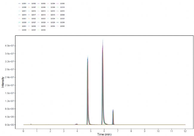 QC樣本:Quality Control樣本,是將所有實(shí)驗(yàn)樣本混合而成的一例額外樣本。理論上來說該樣本含有所有樣本中的所有種類物質(zhì),因此該樣本可以作為全部樣本的“代表”,可以在不影響實(shí)驗(yàn)樣本檢測(cè)的情況下,通過對(duì)QC樣本的檢測(cè),來判斷整個(gè)實(shí)驗(yàn)檢測(cè)是否穩(wěn)定。