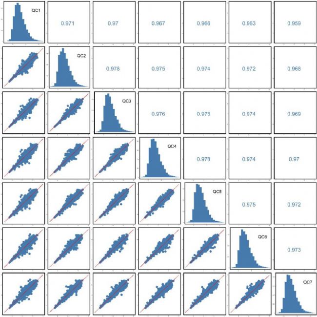 PCA得分圖更多是以圖中樣本位置來判斷數(shù)據(jù)的質(zhì)量,而QC樣本相關(guān)性則是通過樣本中測(cè)到的數(shù)據(jù)進(jìn)一步判斷數(shù)據(jù)質(zhì)量。既然QC樣本是技術(shù)重復(fù),那QC樣本間的差異應(yīng)該是很小的,我們對(duì)QC樣本中測(cè)到所有物質(zhì)在一起計(jì)算相關(guān)性,這個(gè)相關(guān)性值越接近1越好。
