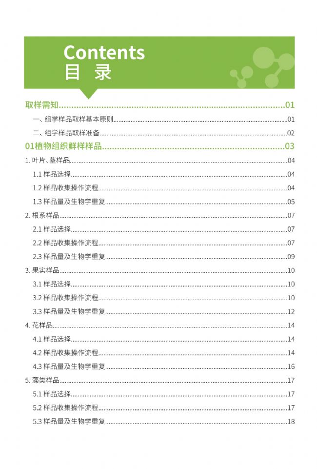 本手冊涵蓋了用于代謝組學、蛋白質組學等組學檢測常見的植物組織鮮樣樣品、植物組織干燥樣品、細胞(菌體)樣品、液體樣品、土壤樣品的取樣收集步驟,其中包含了樣品的選擇、樣品收集操作詳細流程和樣品量及生物學重復。