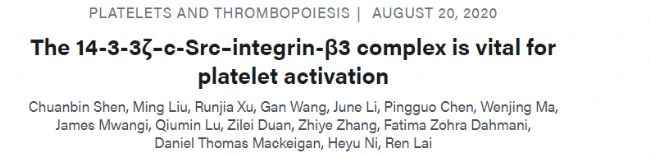 2020年8月,中國科學(xué)院昆明動物研究所研究員賴仞團(tuán)隊在專業(yè)期刊《Blood》(2021 IF=22.113)發(fā)表了在抗血栓領(lǐng)域的突破性成果。該團(tuán)隊發(fā)現(xiàn),由血小板β3整合素、14-3-3ζ蛋白以及c-Src激酶構(gòu)成的復(fù)合體在血小板激活和血栓形成中發(fā)揮重要作用。14-3-3ζ蛋白通過同時結(jié)合于β3整合素胞內(nèi)“TST”結(jié)構(gòu)域和c-Src的SH2結(jié)構(gòu)域,促進(jìn)14-3-3ζ-c-Src-integrin-β3復(fù)合體的形成以及αIIbβ3整合素外向內(nèi)的信號傳導(dǎo)。針對此復(fù)合物形成的關(guān)鍵結(jié)合位點,該研究設(shè)計發(fā)掘了兩個抑制劑KF7、THO。這些抑制劑可干擾14-3-3ζ-c-Src-integrin-β3復(fù)合體的形成并抑制血小板的聚集和延展,但不會顯著改變αIIbβ3與其配體(纖維蛋白原)的結(jié)合以及血小板的黏附。小鼠模型實驗發(fā)現(xiàn),干擾該復(fù)合體能夠顯著抑制血栓發(fā)生,但不會增加出血風(fēng)險。
