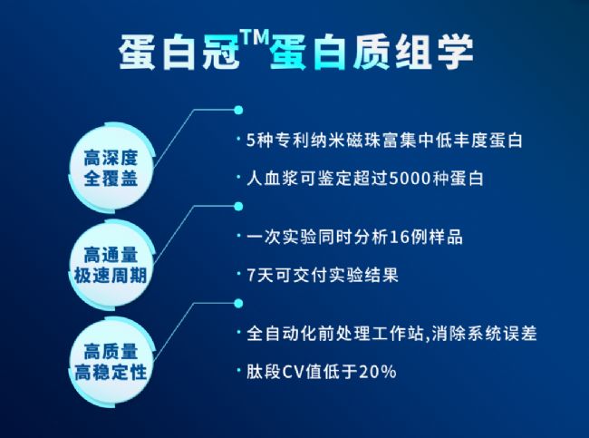 專注創(chuàng)新質(zhì)譜技術(shù)10年的百趣生物,持續(xù)引領(lǐng)質(zhì)譜檢測服務潮流,與應脈醫(yī)療達成戰(zhàn)略合作,推出革新產(chǎn)品蛋白冠™蛋白質(zhì)組學科研服務產(chǎn)品,在基于5種專利的納米磁珠組合的Proteograph™技術(shù)體系的基礎(chǔ)上,百趣生物將高精度高分辨質(zhì)譜與該體系聯(lián)用,可實現(xiàn)(1)人血漿可鑒定超過5000(5K)種蛋白;(2)一次實驗同時分析16例樣品,7天可交付實驗結(jié)果;(3)全自動化前處理工作站,消除系統(tǒng)誤差,肽段CV值低于20%。該產(chǎn)品將為科研工作者提供“高深度全覆蓋”、“高通量極速周期”、“高質(zhì)量高穩(wěn)定性”的血漿5K蛋白質(zhì)組學檢測,極大地提高相關(guān)研究的數(shù)據(jù)質(zhì)量與工作效率。